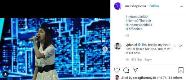 "This is such a heart breaking news (ini kabar yang menyakitkan). Gue bersyukur bisa ketemu langsung dan mendengar suara indah Melisha di @indonesianidoljunior 5 tahun yang lalu," tulis Daniel, seperti iNews.id kutip dari akun Instagram pribadinya, Rabu (9/12/2020).