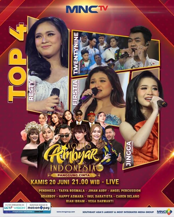 MNCTV menayangkan secara langsung Top 4 Kontes Ambyar Indonesia 2024 'Panggung Cinta' pada Kamis, 20 Juni 2024, pukul 22.00 WIB.