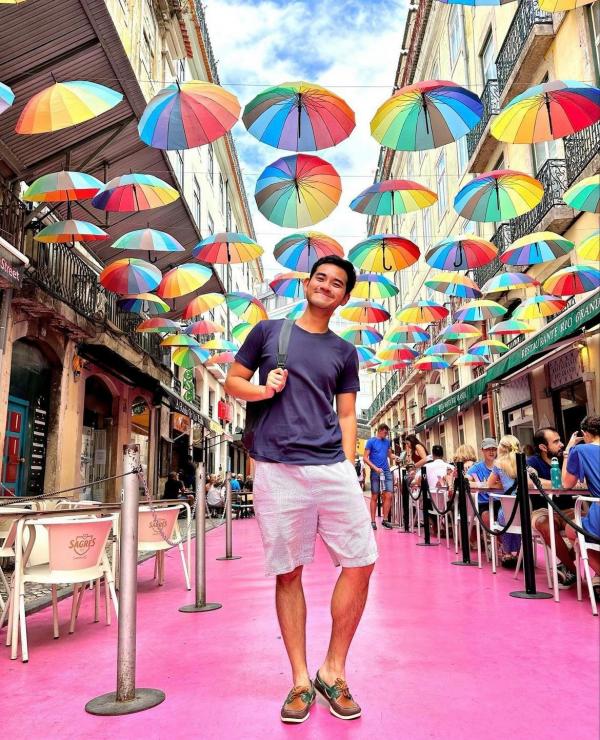 Adriel Tjokro juga sempat mengunjungi Lisbon, Portugal yang terkenal dengan keeksotisannya. Dia berfoto di jalanan berwarna pink, tepat bawah payung warna warni yang digantung menghiasi jalanan.