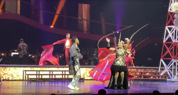 Isyana juga mempermanis penampilannya dengan siger sunda berwarna emas. Penampilannya bikin penonton terpana saat membawakan lagu asal Jawa Barat ini.
