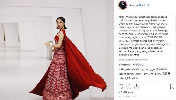 Musisi dan para pelakon seni turut larut dalam kemeriahan perhelatan bersejarah tersebut. Rinni Wulandari adalah salah satu musisi yang turut meramaikan panggung megah pembukaan Asian Games 2018 ini.