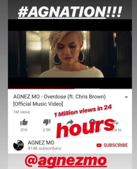 "#AGNATION!!! 1 Millions views in 24 hours," demikian tulisan yang dikutip dari Instagram Story Agnez Mo, Sabtu (15/9/2018).