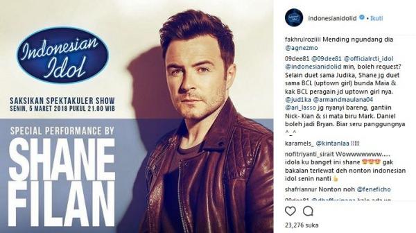 "Hai hai Idol Lovers! Jangan sampai kelewatan penampilan dari Top 7, dan akan ada Special Performance dari @shanefilanofficial yang akan ikut mengguncang panggung Indonesian Idol! @officialrcti #IndonesianIdol," tulis akun Instagram Indonesian Idol, seperti dikutip iNews.id Minggu, (4/3/2018).