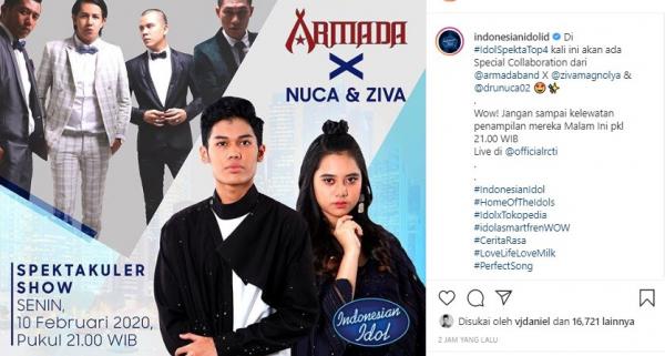 “#IdolSpektaTop4 kali ini akan ada Special Collaboration dari @armadaband X @zivamagnolya & @drunuca02,” tulis Instagram Indonesian Idol.