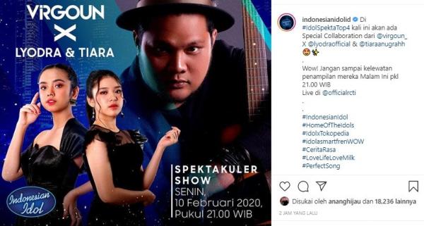 “Di #IdolSpektaTop4 kali ini akan ada Special Collaboration dari @virgoun_ X @lyodraofficial & @tiaraanugrahh,” tulis Instagram resmi Indonesian Idol, dikutip iNews.id pada Senin (10/2/2020).
