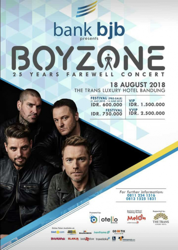 BANDUNG, iNews.id - Bandung menjadi kota pertama yang disinggahi Boyzone, boy band asal Irlandia saat menggelar konser perpisahan. Acara yang bertema BOYZONE 25 YEARS FAREWELL CONCERT ini akan digelar di beberapa kota di Indonesia, salah satunya Bandung.