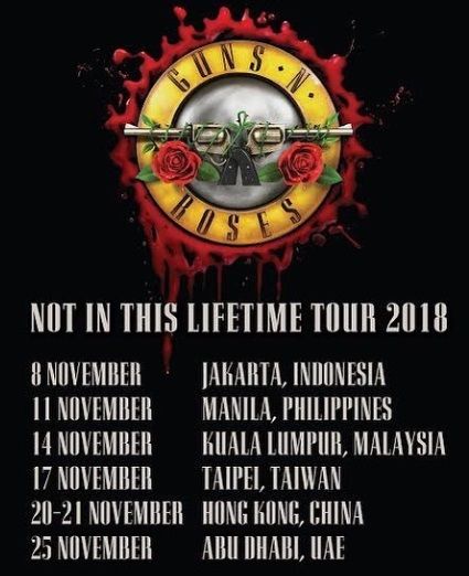 Melalui akun Instagram resminya, Guns N Roses telah mengumumkan akan tampil di Indonesia pada 8 November 2018. Legenda rock ini telah mencatat Jakarta untuk kota yang disinggahi dalam rangkaian tur bertajuk Not in This Lifetime yang telah berlangsung lama.