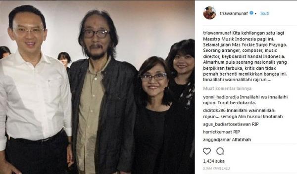 Dalam foto yang diunggah, Triawan Munaf menampilkan foto Yockie yang tampak bugar bersama mantan Gubernur DKI Jakarta Basuki Tjahaja Purnama. Yockie diketahui tutup usia di RSPI Bintaro, pukul 07.35 WIB.
