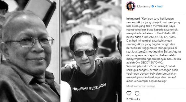 Melalui keterangan foto hitam putih yang menampilkan sosok Amoroso Katamsi dan Deddy Sutomo, Lukman mengenang momen kebersamaannya dengan para aktor senior tersebut.