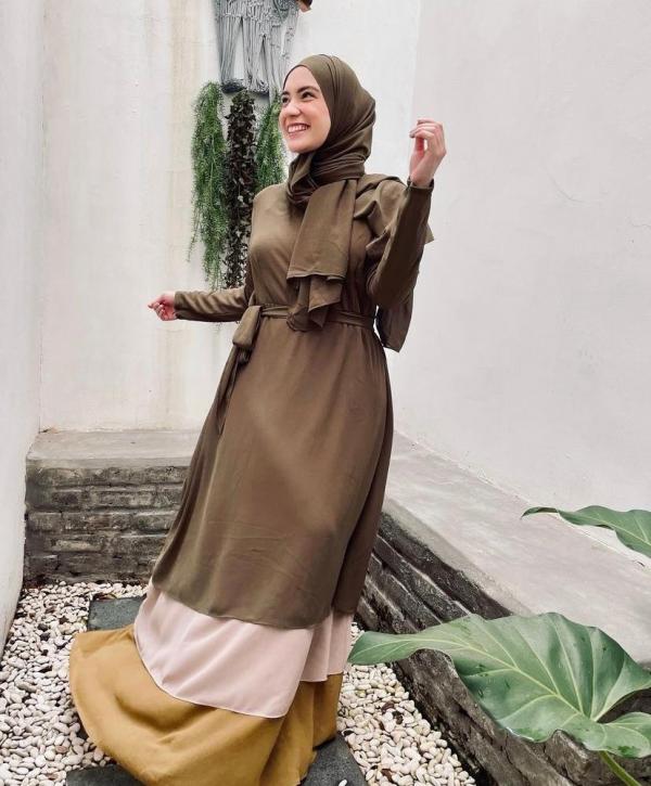 Ibu anak satu ini tampil sederhana dengan mengenakan gamis loose berwarna olive. Dia juga menyempurnakan penampilannya dengan kerudung pashmina berwarna serupa.
