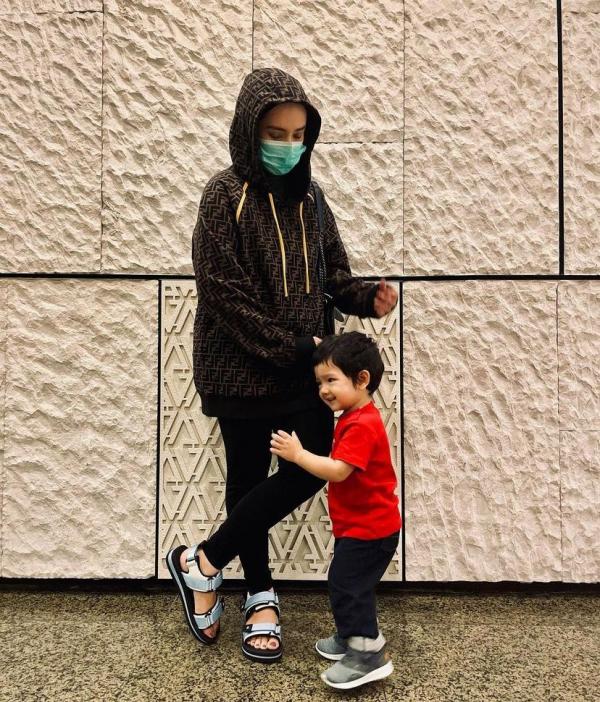 Di urutan terakhir, perempuan 30 tahun ini tampil casual dengan perpaduan hoodie, celana panjang, ciput dan sepasang sandal bernuansa biru hitam. Istri Arya Saloka tersebut juga tampak memakai tas merek ternama yang diketahui seharga puluhan juta.