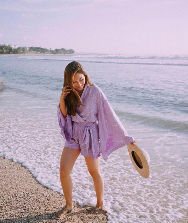 Di foto pertama ini, aktris 28 tahun tersebut tampak menikmati liburannya di pinggir Pantai Kuta, Bali. Bersenang-senang di pantai, Jessica Mila tampak mengenakan baju santai berbahan ringan dan loose berwarna lilac yang cantik. Busana tersebut mempunyai aksen kimono di bagian lengan dan dadanya.