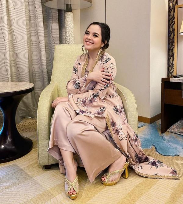Wanita lulusan UI ini tampil dengan outfit Ramadhan berupa blazer panjang motif bunga-bunga berwarna pink. Dipadukan dengan celana panjang warna senada, membuat penampilannya nampak anggun.