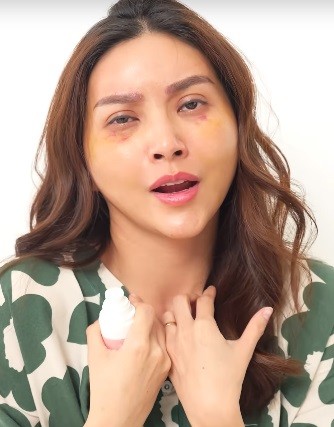 Dalam foto pertama terlihat wajah Sarwendah sangat bare face. Luka di bawah mata tidak ia tutupi dengan concealer. Karena posenya agak mendongak ke atas, rahangnya yang masih bengkak pun terpampang nyata.