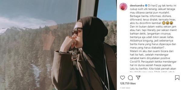 Dewi kembali menambahkan, “Malam ini aku dan suami bicara dari hati ke hati.. setelah mendengar sahabat kami dinyatakan positive Covid19. Percayalah ketika mendengar hal ini dunia seolah freeze sejenak. Lalu ku berfikir. Kita tidak pernah akan tau takdir apa yang Allah catat untuk kami tapi satu2nya kekuatan yang bisa kami kendalikan adalah menundukkan diri kepadaNya.”