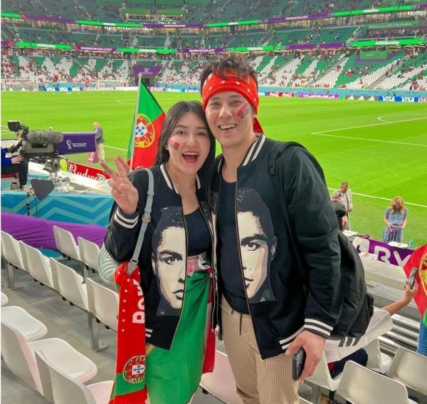 Via Vallen bersama suami tercinta, Chevra menonton Piala Dunia 2022 di Qatar. Dengan mengenakan atribut bercorak logo timnas Portugal, Via tersenyum sumringah berfoto dengan latar lapangan sepak bola.