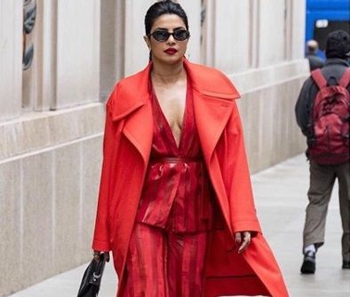 Gaya busana sexy red ala aktris terkemuka Bollywood ini, mungkin cocok bagi Anda yang berani tampil sebagai pusat perhatian. Di sini Chopra berani tampil serbamerah dengan padu padan setelan motif garis merah terang-marun, jaket mantel karya desainer Yumi Mori, plus sepatu high-heels merah yang senada dengan suits dan mantelnya. Agar tak monoton, dia menjinjing warna tas berwarna hitam.