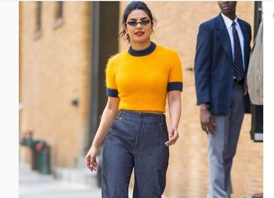 Nah, jika Anda ingin tampil kasual dan kekinian, tiru gaya sweaty casual ala Chopra. Dia memadukan atasan Ganni warna kuning yang bahannya mirip sweater dan celana jins yang memiliki aksen gaya cutbray. Agar lebih simpel, padukan saja dengan flatshoes.