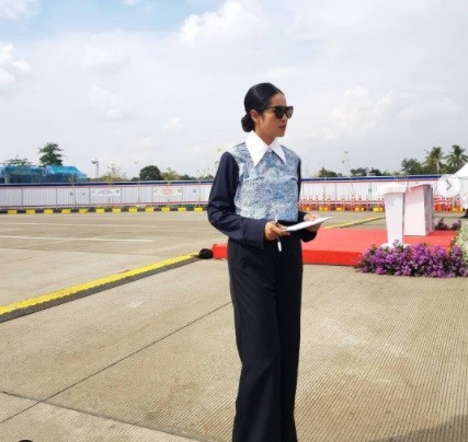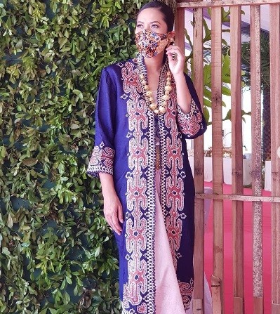 Outwear etnik navy dengan dress baby pink, menjadi perpaduan yang cantik dan elegan. Sari menambahkan kalung sebagai aksesorinya, serta masker bermotif batik, serta heels khaki.
