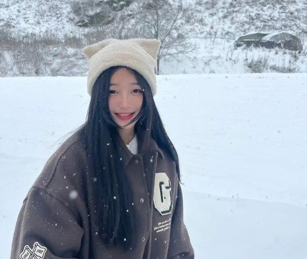 Pada momen ini Tzuyang tampak happy sekali main salju. Penampilannya khas sekali Korean style, dengan bomber jacket oversized ditambah beanie menggemaskan.