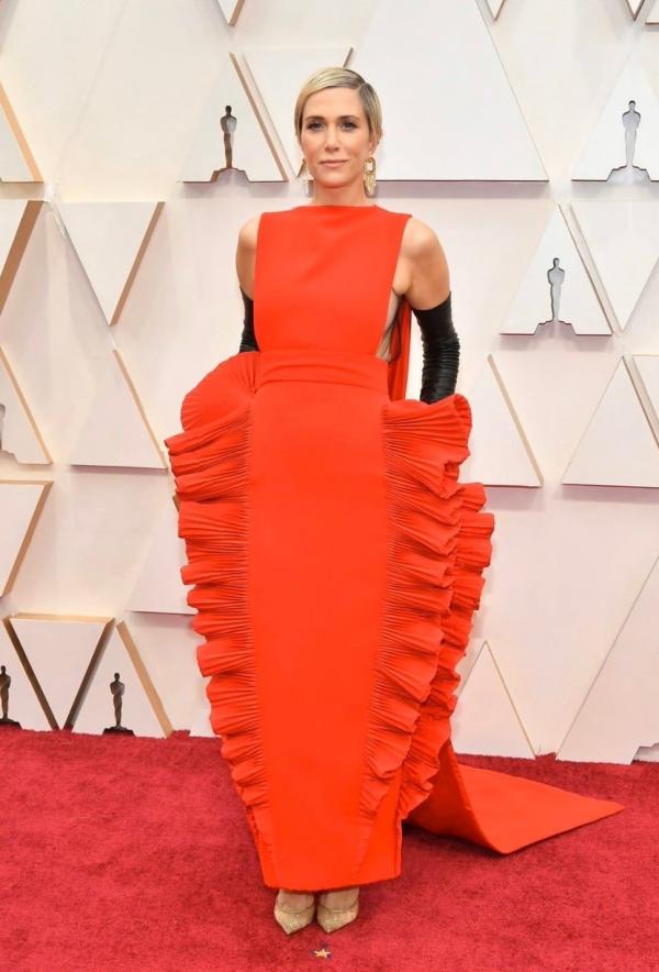 Gaun merah menyala dengan siluet yang aneh membuat Kristen Wiig tampak tidak proporsional. Apalagi gaun itu dikombinasikan dengan sarung tangan hitam dan sepatu berwarna emas, yang tampak tidak serasi. Alhasil, aktris Bridesmaids ini disebut mirip lasagna.