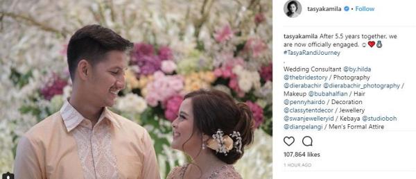 ”After 5.5 years together, we are now officially engaged. ☺ï¸â¤ï¸ðŸ’ #TasyaRandiJourney,” ucap @tasyakamila, Minggu (1/7/2018).