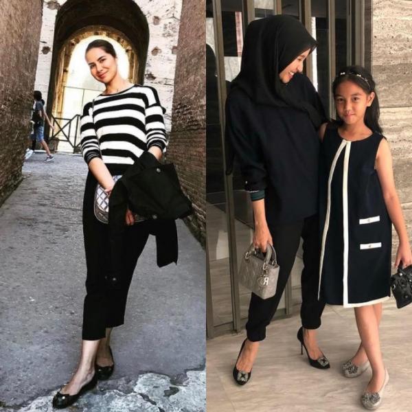 Di foto ini, keduanya tampak berpenampilan simple dan sederhana. Noor Nabila kelihatan mengenakan setelan busana hitam-putih yang classic, sementara Laudya Cynthia Bella tampak sangat santai dengan setelan busana serta hijab hitam yang serasi.