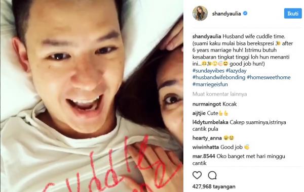 ”Husband wife cuddle time. (suami kaku mulai bisa berekspresi after 6 years marriage huh! Istrimu butuh kesabaran tingkat tinggi loh hun menanti ini. good job hun!),” tulis @shandyaulia.