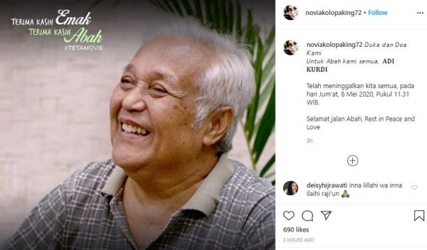 “Duka dan Doa Kami. Untuk Abah kami semua, ADI KURDI. Telah meninggalkan kita semua, pada hari Jum'at, 8 Mei 2020, Pukul 11.31 WIB,” tulis Novia Kolopaking di Instagram, dikutip iNews.id pada Jumat (8/5/2020).