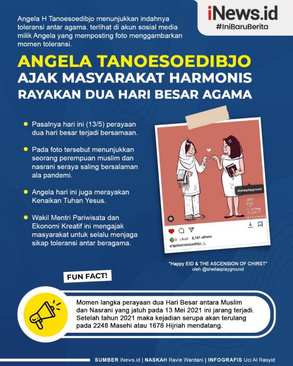 JAKARTA, iNews.id – Angela H Tanoesoedibjo menunjukkan indahnya toleransi antar agama. Hal ini terlihat di akun sosial media milik Angela yang memposting sebuah foto menggambarkan momen toleransi beragama. Pasalnya hari ini, perayaan dua hari besar terjadi bersamaan.
