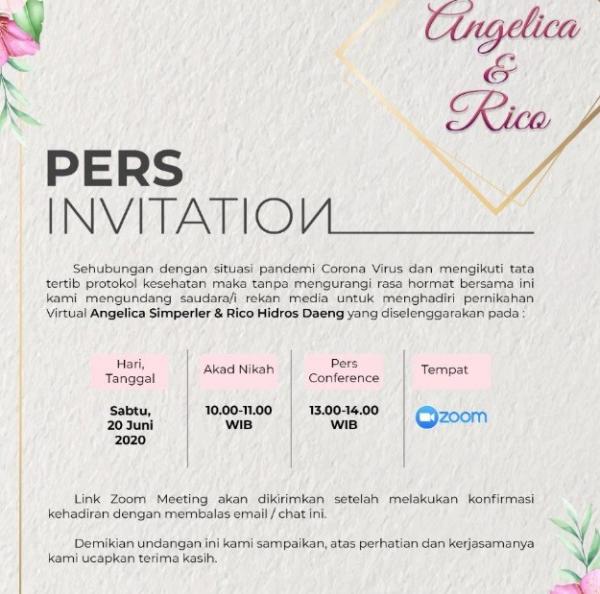 “Sehubungan dengan situasi pandemi corona virus dan mengikuti tata tertib protokol kesehatan maka tanpa mengurangi rasa hormat bersama ini kami mengundang saudara/i media untuk menghadiri pernikahan virtual Angelica Simperler & Rico Hidros Daeng,” demikian bunyi undangan tersebut yang diterima iNews.id, Kamis (18/6/2020).