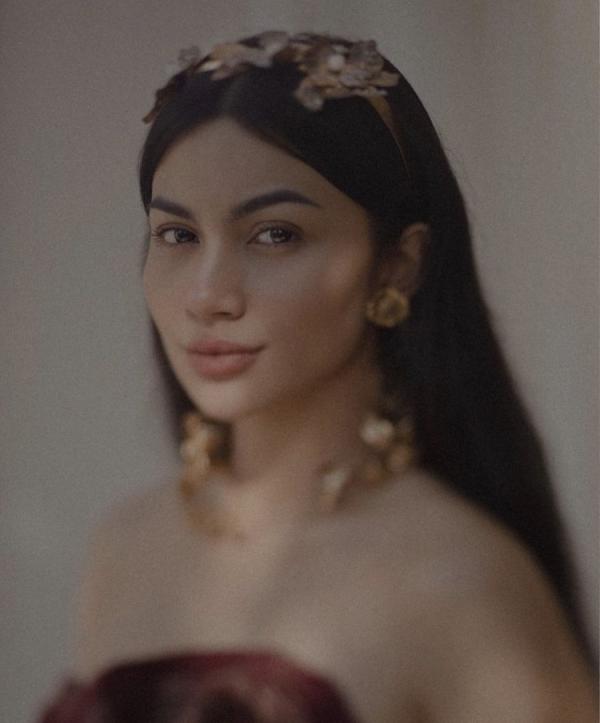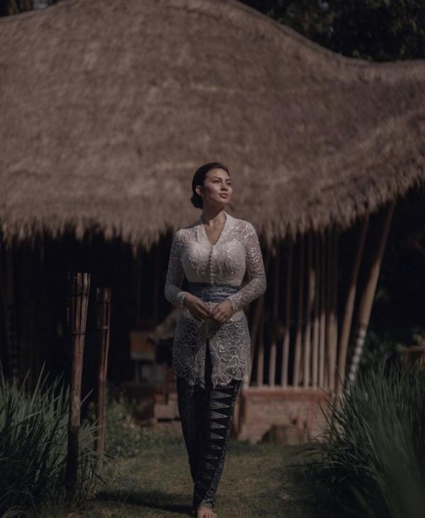 Mantan kekasih Ello ini pun terlihat begitu anggun dengan balutan kain songket Bali bewarna merah maroon. Ditambah dengan aksesoris aksen emas yang dia kenakan, mulai dari gelang, kalung, anting, hingga hiasan kepala.