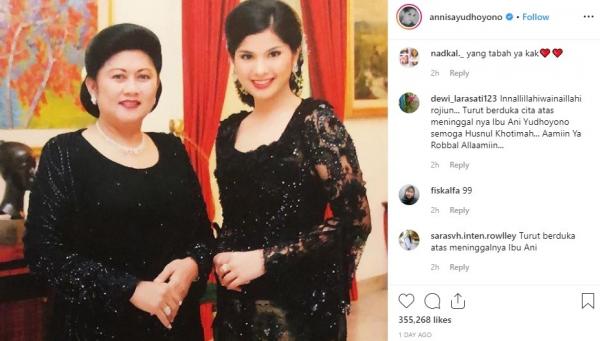 Istri Agus Harimurti Yudhoyono (AHY) itu juga mengunggah foto berdua dengan Ani Yudhoyono. Keduanya tampil serasi mengenakan kebaya.