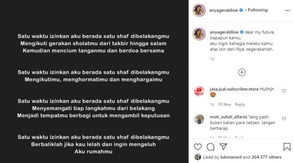 Di postingannya tersebut, Anya mengunggah foto berlatar hitam yang menampilkan tulisan atau pesan darinya untuk calon pendampingnya kelak.