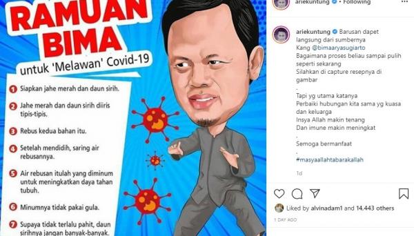 “Barusan dapet langsung dari sumbernya Kang @bimaaryasugiarto. Bagaimana proses beliau sampai pulih seperti sekarang,” tulis Arie Untung seperti dikutip dari Instagram, Selasa (21/4/2020).