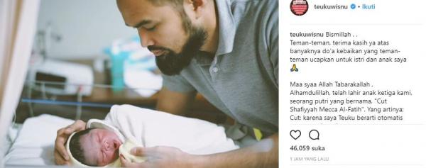 “Bismillah . Teman-teman, terima kasih ya atas banyaknya do'a kebaikan yang teman-teman ucapkan untuk istri dan anak saya. Maa syaa Allah Tabarakallah , Alhamdulillah, telah lahir anak ketiga kami, seorang putri yang bernama, "Cut Shafiyyah Mecca Al-Fatih". Yang artinya; Cut: karena saya Teuku berarti otomatis nama untuk anak perempuan saya depannya Cut, kalau laki-laki Teuku. Shaffiyah: Salah satu istri dari Rasulullah Shalallahu 'alaihi wa sallam, seorang Ummul Mukminin yang cerdas. Mecca: Kota Mekah, kota yang banyak sekali keutamaannya dan kota yang diberkahi Allah Ta'ala. Al-Fatih: semua anak kami belakangnya memakai ini,” tulis @teukuwisnu.