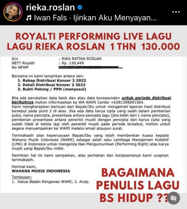 Di akhir unggahannya, dia kembali menyoroti nominal royalti yang diterimanya, yakni Rp130 ribu per tahun atau sekitar Rp10 ribu per bulan. "Cukup beli apa ya 130.000 : 12 ? ? = 10.833,” tulis Rieka.