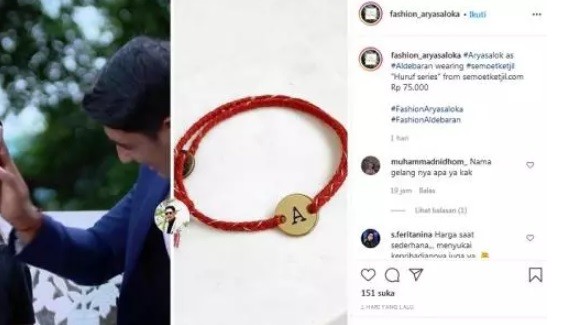 Contohnya gelang handmade warna merah yang terlihat dipakai Arya, di dua episode teranyar Ikatan Cinta baru-baru ini. Di akun Instagram @fashion_aryasaloka, gelang bandul inisial huruf A tersebut merupakan keluaran koleksi Semoet Ketjil. Tertulis dalam keterangan foto, gelang Arya tersebut dibanderol seharga Rp75.000 saja per satu piece. Harga aksesori yang terjangkau ini pun tak ayal membuat para penggemar senang.