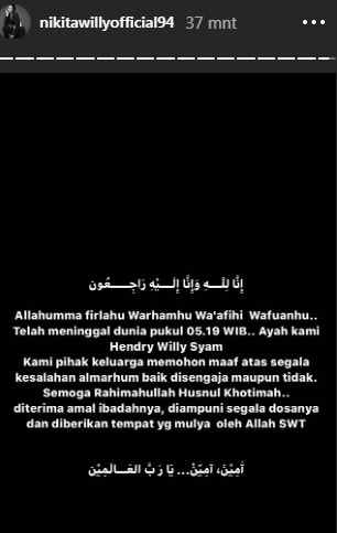 "Kami pihak keluarga memohon maaf atas segala kesalahan almarhum baik disengaja maupun tidak," tulis Nikita.