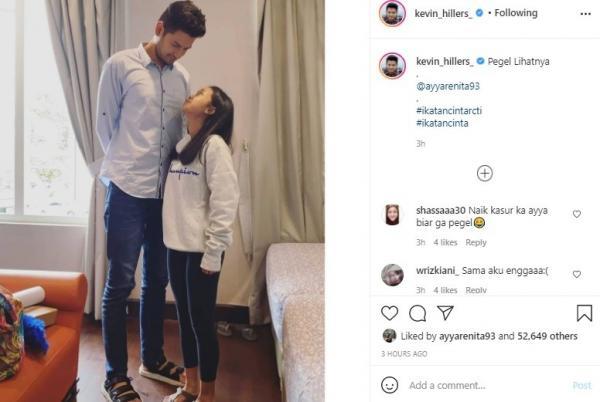 Di foto tersebut, tampak Kevin sedang berdiri bersisian dengan aktris 27 tahun itu. Tubuh Ayya yang mungil kelihatan setara dengan dada sang aktor.