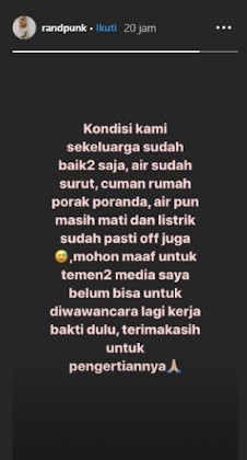 Bahkan dia mengatakan, rumahnya yang terdampak banjir tersebut kondisinya porak-poranda. "Kondisi kami sekeluarga sudah baik-baik saja, air sudah surut, cuman rumah porak poranda," tulis aktor Kucumbu Tubuh Indahku tersebut, seperti dikutip iNews.id dari Instagram Story-nya, Jumat (3/1/2020).