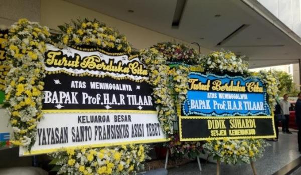 "Turut berduka cita atas meninggalnya Bapak Prof. H.A.R Tilaar," demikian salah satu karangan bunga yang datang dari keluarga mantan Presiden RI KH Abdurrahman Wahid (Gus Dur).