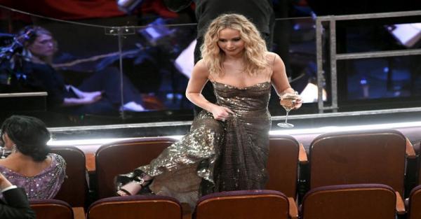 Diberitakan People, Senin (5/3/2018) Sesaat sebelum perhelatan dimulai, J.Law dengan santai memanjat deretan kursi yang berjejer sambil memegang segelas anggur di tangan kirinya.