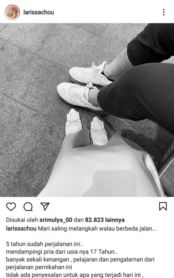 Meskipun tak mengungkapkan penyebab perceraiannya, Larissa menegaskan dirinya berpisah baik-baik dengan putra mendiang Ustadz Arifin Ilham itu. Dia membagikan gambar hitam putih yang menampilkan gambar alas kaki dirinya dan mantan suaminya di Instagram.