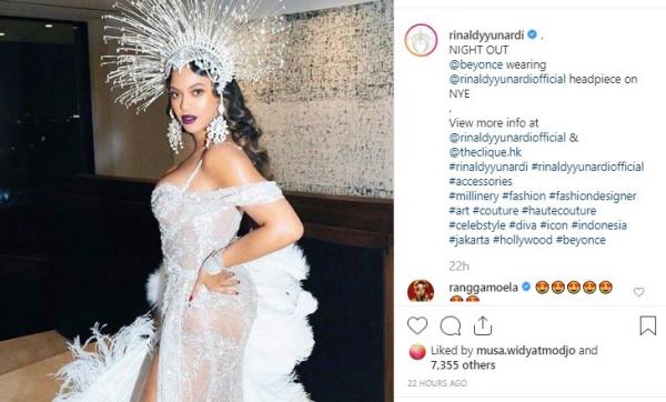 "NIGHT OUT @beyonce wearing @rinaldyyunardiofficial headpiece on NYE," tulis desainer yang akrab disapa Yungyung tersebut, seperti dikutip dari Instagram, Selasa (24/9/2019).