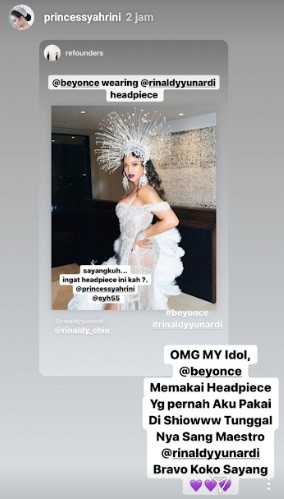 "OMG My idol @beyonce memakai headpiece yang pernah aku pakai di show tunggalnya sang maestro @rinaldyyunardi," tulis Syahrini melalui unggahan Instagram Story miliknya.