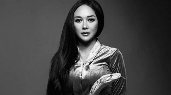 Sementara itu, pada foto kedua dengan konsep hitam putih, Aura Kasih menampilkan ekspresi yang jauh lebih tajam. Tatapannya lurus ke arah kamera, sementara ular besar masih melingkar di tubuhnya, dengan lidah yang tampak berdesis, menambah kesan dramatis.