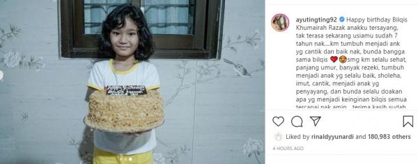 JAKARTA, iNews.id - Ayu Ting Ting memberikan kabar bahagia. Hari ini sang putri, Bilqis Khumairah Razak merayakan ulang tahun ketujuh.