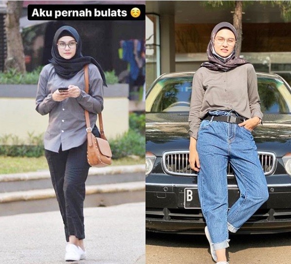 "Foto kanan 2020, Sekarang (53kg) di mulai aja dulu..," tulisnya lagi.