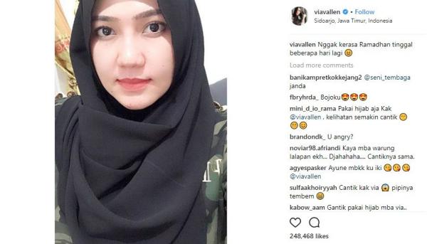 Dalam fotonya itu, tampak Via Vallen tersenyum tipis saat mengenakan baju lengan panjang motif hijau loreng yang dipadukan dengan hijab hitam menutupi dada. Melihat pesona Via Vallen berhijab, sontak para netizen memberikan pujian dan doa di kolom komentar.